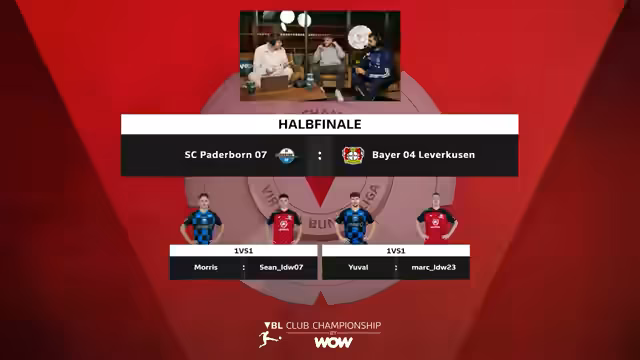04:24:23Die Halbfinals werden vorgestellt: RB Leipzig vs. SC Freiburg und SC Paderborn 07 vs. Bayern 04 Leverkusen. Experten wie Timo und Ali Hahn (E-Sportler des FC Schalke 04) schließen sich dem Studio an. Ali Hahn äußert sich aufgeregt zum neuen System und der "neuen Ära" der VBL. Es folgt ein Tippspiel mit dem Chat: Leipzig vs. Freiburg (Eins: Leipzig, Zwei: Freiburg) und Paderborn vs. Leverkusen (Eins: Paderborn, Zwei: Leverkusen). Die Experten diskutieren die Chancen, wobei Ali Hahn trotz Schalkes Niederlage durch Leverkusen zu Leverkusen tendiert. Die Stimmung ist aufgeladen, mit Hinweisen auf hochkarätige Duelle wie Morris gegen Sean und Juval gegen Marc Landwehr.