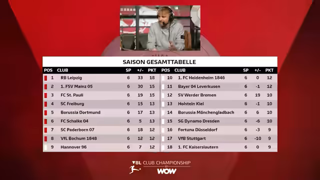 00:14:32Die 16 qualifizierten Teams werden vorgestellt, nachdem die Vorrunde bereits stattfand. RB Leipzig thront an der Spitze der Gesamttabelle, während Dynamo Dresden als Neuling und Überraschungsteams besonders hervorgehoben wird. Dresden profitierte von der kurzen Anreise nach Leipzig. VfB Stuttgart verpasste die Qualifikation knapp, Holstein Kiel wird für starke Leistungen gelobt. FC Bayern München fehlt überraschend mit acht Punkten, was das hohe Niveau der Liga unterstreicht, da die Bayern sonst immer bei Offline-Events dabei waren.