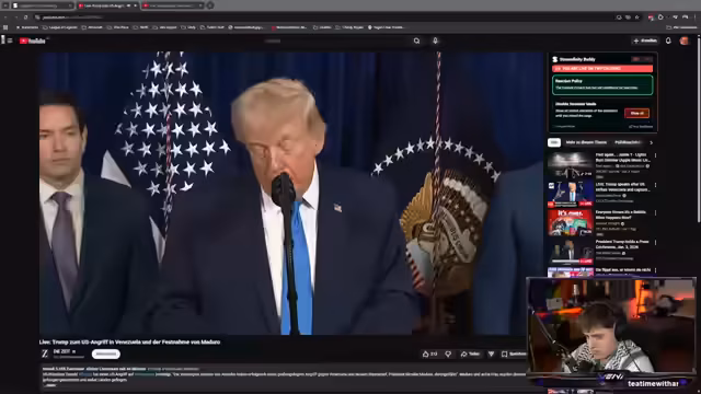 06:39:30Der Streamer reagiert auf Informationen über die E-Tech-Group, die er als verdächtiges Unternehmen für Geldwäsche und AI Cyber Defense bezeichnet. Er verweist auf die Festnahme des honduranischen Präsidenten Juan Orlando Hernández, der wegen Drogenhandels in den USA zu 45 Jahren Haft verurteilt wurde, und seine bedingungslose Freilassung durch Donald Trump. Der Streamer fragt, warum dieser Fall im Gegensatz zur Situation in Venezuela in den Medien kaum Beachtung findet und stellt die These auf, dass Trump Oppositionspolitikerin Maria Corina Machado unterstützt, um an die venezolanischen Ölvorkommen zu gelangen.