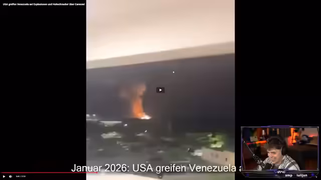 06:52:48Der Streamer berichtet über laufende, massive Bombardierungen in der Hauptstadt Caracas, Venezuela, und identifiziert dies als eine genehmigte US-Militäraktion unter Donald Trump. Er beschreibt Explosionen auf Militärgeländen und im Hafen sowie den Einsatz von Transporthelikoptern, der auf den Einsatz von Bodentruppen hindeutet. Er bewertet dies als einen Versuch der USA, einen Regime-Change durchzuführen, und kritisiert die westliche Medienberichterstattung, die die Invasion als 'spezielle Militäroperation' euphemistisch verschleiert.