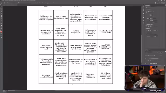 08:24:33Nach intensiver Diskussion mit dem Chat werden Felder für das 2026-Bingo festgelegt: Dazu gehören 'Grönland wird angegriffen', 'Influencerin wird verhaftet', 'GTA 6 Release verschoben', 'KI-Bubble platzt', 'Social Media-Dienst in EU verboten' und 'Böllerverbot in DACH'. Weitere Punkte sind 'Wahlmanipulation in USA/Ungarn', 'Celebrity stirbt an Biohacking' und 'Problematische Person bei Stream Awards nominiert'. Das Bingo wird als ernste Momentaufnahme der Welt geschildert, mit dem Hinweis, Leiden nicht auszulachen.