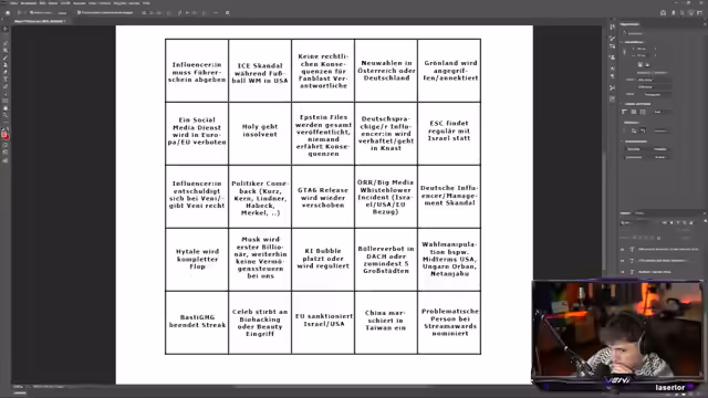 08:24:03Der Streamer geht auf das Bingo für das Jahr 2025 zurück und analysiert, welche Vorhersagen sich erfüllt haben. Anschließend beginnt er mit der Planung des 'Bingo 2026' und bittet die Chat-Community um Vorschläge. Die Themen reichen von allgemeinen Weltevents wie der US-Präsidentschaft bis zu spezifischen Ereignissen im deutschsprachigen Raum, wie Neuwahlen in Österreich oder Deutschland, oder Skandalen im Influencer-Bereich. Ziel ist es, eine realistische, aber auch kontroverse Prognose für das kommende Jahr zu erstellen.