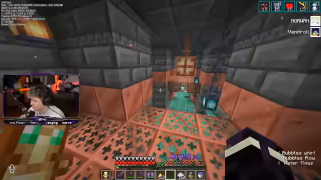 03:00:18Der Streamer beschließt, eine Trial Chamber mit dem Bohrer zu zerstören, um zu sehen, was sich darin befindet. Während des Vorgangs werden immer wieder Diamanten gefunden, was die Effizienz des Bohrers unterstreicht. Es wird diskutiert, ob die Zerstörung der Trial Chamber die Diamantengenerierung in den umliegenden Gebieten erhöhen könnte, da der Spawn-Space für Diamanten innerhalb der Kammer wegfällt. Die Meinungen im Chat dazu sind geteilt. Ein weiteres technisches Problem, das diskutiert wird, ist die Möglichkeit, dass TNT in sogenannten 'Lazy Chunks' gespeichert wird und erst beim Laden des Chunks explodiert, was auf einem Paper-Server jedoch unwahrscheinlich ist. Während des Bohrens kommt es immer wieder zu Beschädigungen der Maschine, insbesondere an den Deepslate-Blöcken, was auf Server-Lag zurückgeführt wird. Der Streamer betont die Wichtigkeit, schnell auf Beschädigungen zu reagieren, um eine vollständige Zerstörung des Bohrers zu verhindern. Trotz der wiederkehrenden Probleme wird die Zerstörung der Trial Chamber fortgesetzt, und es werden weiterhin Diamanten gefunden. Die Diskussion über die Effizienz des Bohrers und die Möglichkeit, Endstone zur Verbesserung der Stabilität zu verwenden, bleibt ein zentrales Thema.