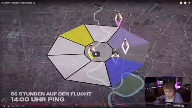 00:33:14Der Streamer startet die Reaction auf Manhunt Folge 12. Zunächst wird kurz Folge 11 zusammengefasst: Joris wurde gefangen, Alex und Chris nehmen an der High Challenge teil. Der Streamer betont, dass beleidigende Kommentare über die Teilnehmer unerwünscht sind und konstruktive Kritik willkommen ist. Die Tageschallenge wird vorgestellt: Die Spieler müssen sich für eine Stunde in einem öffentlich zugänglichen Bereich verstecken. Chris und Alex nehmen teil. Die Hunter dürfen sich bis 12 Uhr in Position bringen, die Jagd beginnt um 12 Uhr. Als Belohnung winkt das Aussetzen von Silent Hunt und das Erfragen der Position der Hunter, was der Streamer jedoch als wenig wertvoll einschätzt. Der Streamer analysiert mögliche Verstecke und kommt zu dem Schluss, dass ein Platz in einem Gebäude recht weit oben am besten geeignet wäre. Er vermutet, dass die Hunter eher auf Augenhöhe suchen werden und ein Versteck in einem höher gelegenen Café daher ideal wäre.