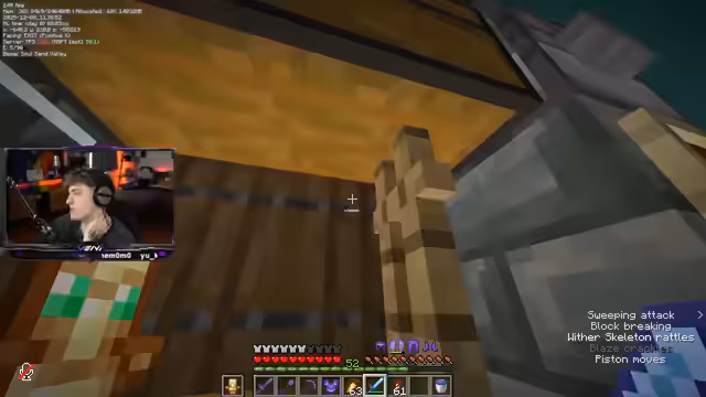 00:19:15Der Streamer demonstriert eine aufwendige Wither-Skelett-Farm im Nether. Er erklärt, dass die Farm normalerweise zwei Spieler benötigt, aber dank eines speziellen Mechanismus' auch alleine funktioniert, wenn kein anderer Spieler auf dem Server ist. Die Mobs werden durch Piglins angelockt, teleportieren sich ins Overworld-Portal und kehren zum Töten zurück. Er zeigt die Funktionalität, bemängelt aber langsame Spawn-Raten. Die Farm ermöglicht effizientes Farmen von Knochen und anderen Drops, die automatisch in Blöcke craften.