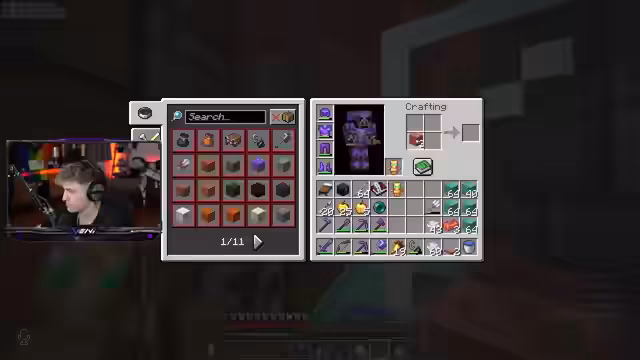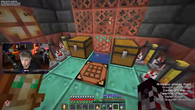 00:06:05Ein Zoglin erscheint im GHG, was den Streamer zu einem Versuch verleitet, diesen mit Windcharges in ein Portal zu locken. Nachdem dies fehlschlägt, wird das Thema der Farmbau beibehalten. Der Streamer plant nun, eine Amadillo-XP-Farm zu bauen und sammelt dafür die erforderlichen Materialien, darunter Glas, Redstone, Pistons und Dispenser. Er diskutiert kurz mit dem Chat über Farm-Design und die Funktionsweise.
