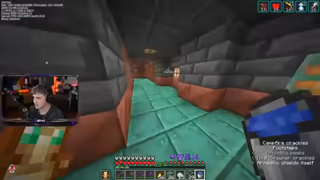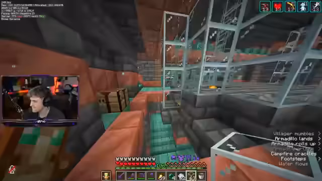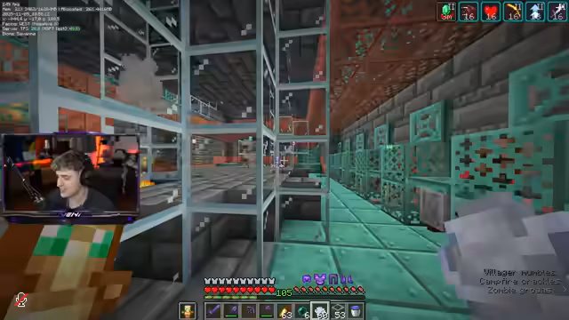 01:09:24Es wird versucht, die Koordinaten des End-Portals herauszufinden, das für das Event genutzt werden soll, da der Seed nicht bekannt ist und VODs oder Kommunikationen als Informationsquellen dienen könnten. Parallel dazu wird das Spawnproofing der Trial Chambers weiter vorangetrieben, indem die Bereiche um die Spawner mit Glasblöcken zugebaut werden, um zu verhindern, dass Mobs außerhalb spawnen. Ein Bienenvolk wird entdeckt, was zu einer kurzen Ablenkung führt. Die Effizienz der Spawner-Farm wird durch das Fahren mit dem Minecraft-Zug getestet, und es wird vermutet, dass die Ausbeute an Schlüsseln steigt, wenn mehrere Spieler gleichzeitig fahren. Die vielen To-Dos und der Kampf gegen die Zeit werden humorvoll als Gegenteil von Arbeitszeitbetrug beschrieben.
