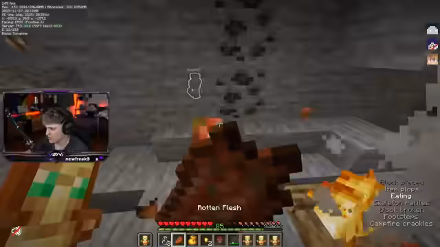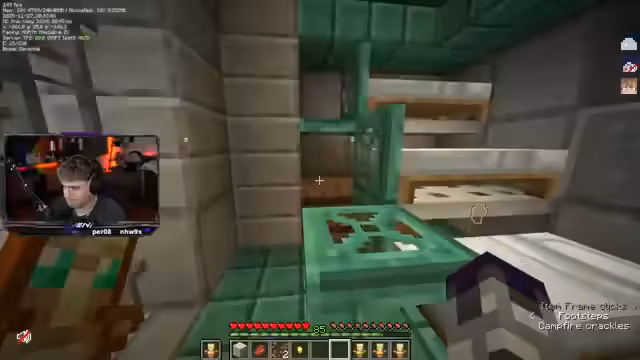 07:22:06In der neuen Zelle entdeckt der Streamer Skulk-Sensoren, die auf Geräusche reagieren. Er findet einen Scrape Pottery Shard und ein Minecart, mit dem er nicht interagieren kann. Er schmilzt weiteres Glas und findet ein drittes Gold Nugget. Nach weiteren Überlegungen und dem Fund eines Bundles, einer Nautilus Shell, White Dye und eines Kompasses, craftet er eine Angel. Er versucht, in verschiedenen Wasserstellen zu angeln, um den Skulk-Sensor zu aktivieren, da er vermutet, dass dies der Schlüssel zum Fortschritt ist. Die Gleichung 'C plus S größer 2C oder 2S' auf einem Zettel verwirrt ihn zusätzlich. Er angelt Pufferfische und einen Lachs, in der Hoffnung, dass das Braten der Fische auf dem Campfire den Sensor auslöst oder ein Signal abgibt.