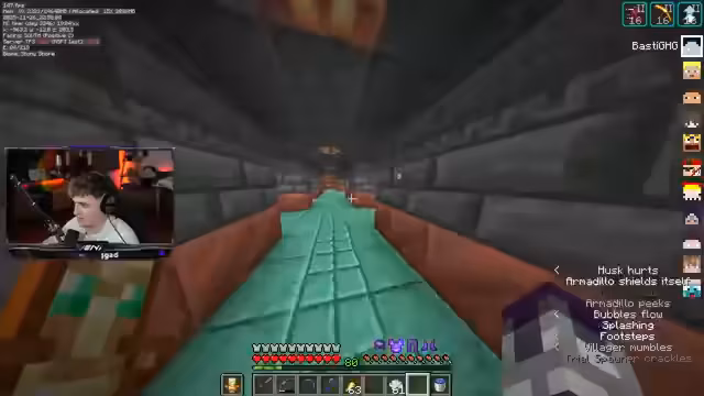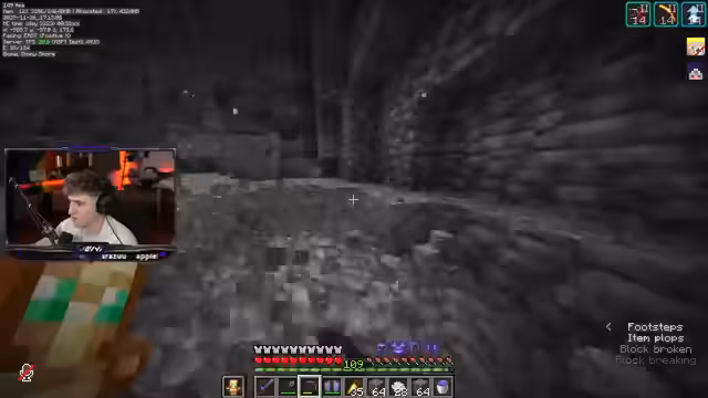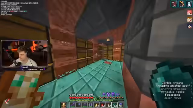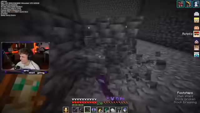 00:11:27Der Streamer konzentriert sich wieder auf sein Bauproblem: die Creeper-Farm, die er in einer Savanne errichtet hat. Er stellt fest, dass die für die Farm benötigten Schneemänner in einem warmen Biom wie der Savanne instantan sterben, was ihm bisher unbekannt war. Er berichtet, dass er für den Bau dieser Farm ein riesiges Loch in Deepslate ausgehoben hat, und nun mit der Frustration konfrontiert ist, das gesamte Projekt aufgeben oder einen extrem aufwendigen Umbau vornehmen zu müssen.
