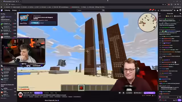 02:35:34Ein Missverständnis bezüglich Quarz und eines geplanten Quarz-Shops aus einer Piglin-Farm sorgt für Heiterkeit, da der Chat genau in dem Moment darauf reagiert, als die Idee geäußert wird. Es wird über eine Steinfabrik und eine Konkretemaschine gesprochen, die Pulver in Beton umwandelt. Ein weiteres Thema ist eine Poppy-Farm, die nicht von Joe gebaut wurde, da die verwendete Clock-Mechanik untypisch für seine Bauweise ist. Die Rede ist auch von einer Bienenfarm und Redstone-Verkabelungen, die Ruth gebaut hat und die sehr gut ankommen. Es wird kurz über die Spendenanimationen für das Charity Royale gesprochen, wobei eine große Animation bei einer Spende von 1000 Euro ausgelöst wird, was die Hoffnung auf reiche Spender weckt.