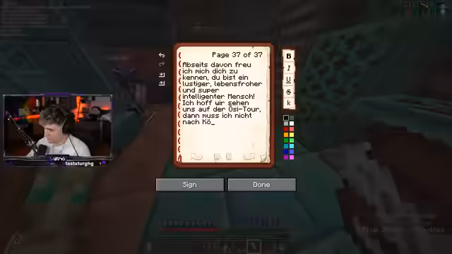 01:47:13Es wird über ein Bauprojekt im Spiel gesprochen, bei dem die Spitze eines Turms im Freizeitpark aus Resin gebaut werden soll. Der Streamer fragt nach Resin und es wird überlegt, ob es eine Resin-Farm gibt. Nach einer kurzen Suche bei 'Carnavas' stellt sich heraus, dass dort keine effektive Farm vorhanden ist. Es wird eine Idee von 'SpaceGuy' diskutiert, die Spitze des Turms mit Redstone-Lampen und Observern zu gestalten, die ein leuchtendes Muster erzeugen. Die Idee ist, den Schriftzug 'Freizeitpark' nach oben laufen zu lassen, was eine 'gottlose Materialschlacht' erfordert. Es werden genaue Mengen an Redstone-Lampen und Observern berechnet: 265 Redstone-Lampen und 530 Observer für eine ursprüngliche Breite von sechs Lampen. Es wird beschlossen, dies umzusetzen, wobei der Streamer die Technik entwickelt und andere bei der Materialbeschaffung helfen. Es wird erwähnt, dass Glowstone am effizientesten durch Handeln mit zombifizierten Clerics und Redstone gewonnen wird. Die Gemeinschaft mobilisiert sich, um die benötigten Materialien wie Quarz und Glowstone zu sammeln. Es wird auch die Möglichkeit einer breiteren Anzeige mit einer Pixeldichte von drei diskutiert, die neun Blöcke breit wäre und perfekt zur Vorderseite des Turms passen würde, jedoch die dreifache Menge an Materialien erfordern würde.