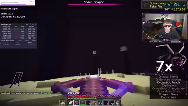 06:18:16Nach einem langen und gefahrvollen Run gelangt der Streamer endlich zum Endportalraum und zum Enderdrachen. Die Herausforderungen des Spiels zeigen sich besonders hier: Der Drache greift aggressiv an, was die Konzentration des Streamers auf das Maximum bringt. Er muss den Dragen mit seinen Ressournen besiegen, was ihm letztendlich gelingt, und kann den Run erfolgreich abschließen.