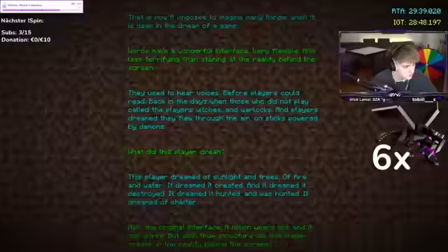 00:14:46Der Stream startet mit zahlreichen Geburtstagsgrüßen für den Streamer veni, der 19 Jahre alt geworden ist. Anschließend stellt er die Challenge für den Tag vor: Er wird Minecraft solange durchspielen, wie Zuschauer abonnieren. Jeder erfolgreiche Run führt zum Dreh eines Glücksrades, das Aufgaben wie Sport, Song Requests oder zusätzliche Runs für den nächsten Versuch festlegt. Wenn ein Sub-Gziel von 550 Abonnements erreicht wird, erhöht sich die Schwierigkeit auf Normal. Happy Hour, die die benötigten Abonnierungen halbiert, wird bei unfreiwilligem Tod ausgelöst. Bits werden aufgrund technischer Einschränkungen nicht gezählt.