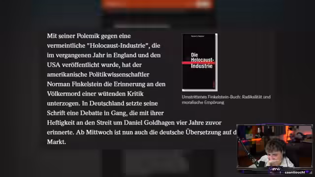 07:38:44Der Stream beginnt mit einer Diskussion über die israelische Politik und die Gleichsetzung von Israel-Kritik mit Antisemitismus. Es wird thematisiert, wie bestimmte Gruppen Kritik an Israel pauschal als antisemitisch abstempeln, was eine sachliche Auseinandersetzung erschwert. Der Streamer erwähnt historische Kontexte, darunter die Instrumentalisierung des Holocausts zur Legitimierung aktueller politischer Handlungen. Zudem wird das Buch von Norman Finkelstein und dessen Rezeption in Deutschland kritisch beleuchtet, insbesondere die mangelnde wissenschaftliche Aufarbeitung seiner Thesen.