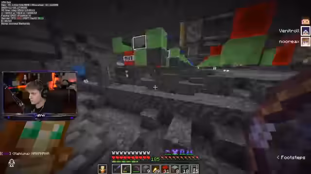03:03:36Der Bohrerturm wird nun fertiggestellt. Der Streamer baut die verbleibenden Teile aus und platziert die finalen Elemente wie die Minecarts und TNT. Gleichzeitig werden mehrere Sicherheitschecks durchgeführt. Es wird insbesondere auf das Spawnen von Creeppern geachtet, deren Explosion den gesamten Bohrer zerstören könnte. Der Streamer äußert seine große Anspannung und bereitet sich auf den finalen Test der Anlage vor.
