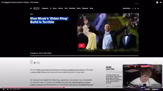 00:10:02Nachdem der Streamer die chatbasierte Vorschläge für Reactions präsentiert, werden zwei Hauptvideos ausgewählt. Zuerst ein Reactions-Video auf ein Interview mit Tomatolix von Varyon, welches für seinen unkonventionellen und provokanten Stil bekannt ist. Zweitens ein Video von Upper Echelon mit dem Titel „The biggest gaming fraud in history, Elon Musk“. Das Elon-Musk-Video wird als Fortsetzung eines vorherigen Videos präsentiert, das dessen angebliches Gaming-Betrug aufdeckte. Der Streamer betont, dass Elon Musk kein ursprünglicher Erfinder von Unternehmen wie Tesla oder SpaceX sei, sondern sich vielmehr hineinge- und aufgekauft habe.
