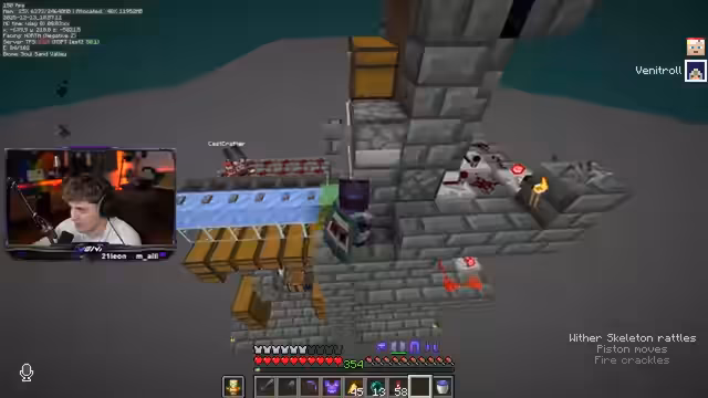 03:13:11In diesem Abschnitt wird ein komplexes Maschinendesign vorgestellt, das durch Freecam-Technik und präzise Platzierung von Target-Blöcken ermöglicht wird. Das System besteht aus vier rotierbaren Maschineneinheiten, die insgesamt 16 Teleporter generieren und flexible Mobilität auf dem Server ermöglichen. Besonders erwähnenswert ist die Lösung eines Bugs bezüglich Arrow-Ownership auf Paper-Servern durch ein maßgeschneidertes Plugin, das permanente Ladung von Pfeilen garantiert. Der Streamer demonstriert zudem die Effizienz der Wither-Skelett-Farm, die nur im Koop-Betrieb funktioniert und massive Loot-Mengen generiert.
