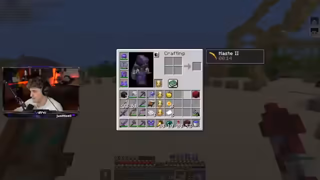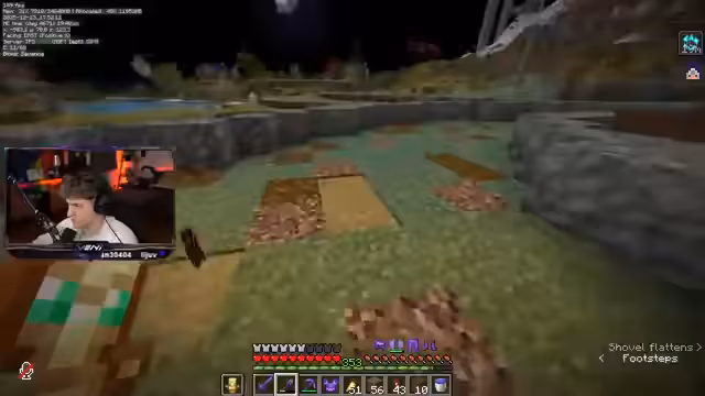 00:42:36Veni analysiert die Ausbeute seiner Raidfarm: Nach mehreren Stunden AFK-Zeit hat er zwei Doppelkisten Gunpowder und 350 Level, ohne dass ein Vex spawnen. Er hält die Farm für sicher für längere AFK-Sessions. Anschließend plant er, Sand in der Wüste zu farmen, um TNT für die Railgun herzustellen. Er erwähnt, dass Duper-Methoden zwar effizienter wären, aber verboten sind. Während des Farmens kommentiert er die umliegenden Projekte anderer Spieler, wie eine Creeper-Farm von Marcel und eine Squid-Farm, die in der Wüste entstanden sind, da zwei große Projekte (Copa Golem und Infinity Castle) viele Ressourcen benötigten.