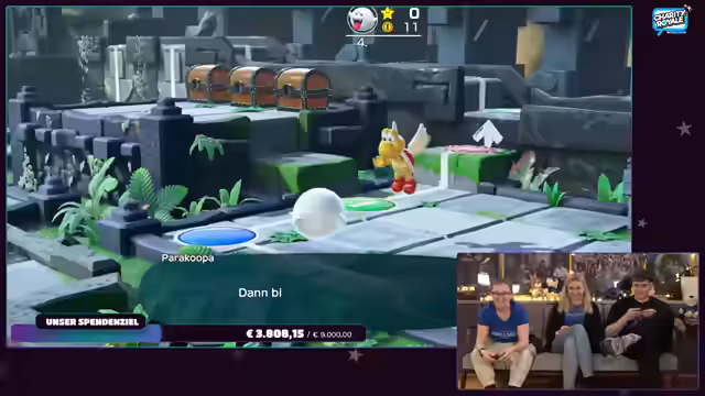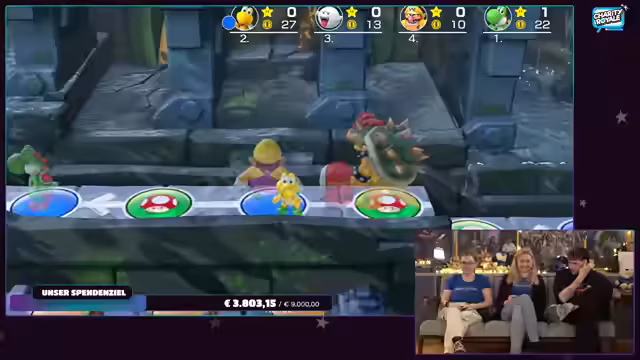 01:32:04Der Fokus liegt auf der Erklärung des aktuellen Spendenziels: die Erfüllung des Wunsches von D., einem 16-jährigen Jungen mit Mukoviszidose. Er sich sich ein spezielles E-Bike, um trotz seiner Krankheit weiterhin Sport zu betreiben. Während der Erklärung erreicht eine Spende von Vivi den Betrag, der die Finanzierung dieses Wunsches komplettiert. Anschließend beginnt eine Runde Mario Party als lockere Aktion, bei der die Teilnehmer sich die Regeln erklären und das erste Spiel startet.