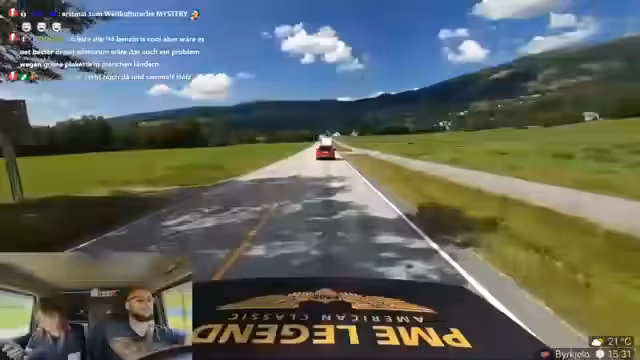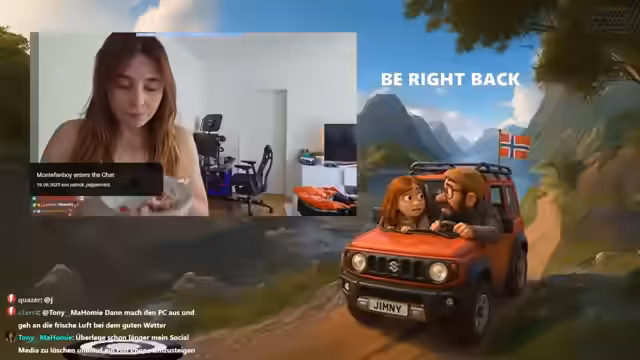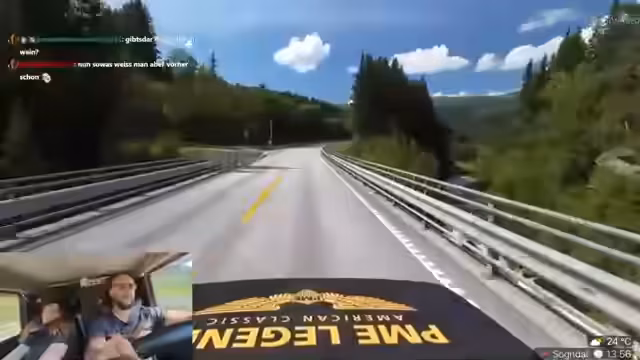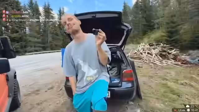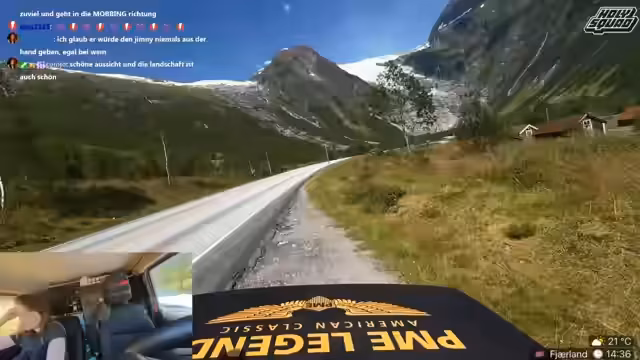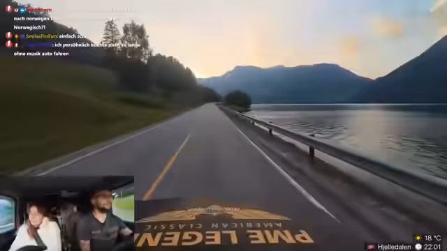 09:38:19Im Stream gibt es zahlreiche Anekdoten und ungeplante Ereignisse. Ein Zuschauer wird als Wiener apostrophiert und es kommt zu einem unangenehmen Vorfall, als Verena versehentlich in einen Bach uriniert und dabei ihre Hose nass macht. Auch die Diskussion über den Motor des Autos wird weitergeführt, wobei Danny die Motor-Kontrollleuchte ignoriert und die Fahrt fortsetzt. Die gesamte Atmosphäre ist geprägt von spontanen Erlebnissen und humorvollen Zwischenfällen während der Fahrt durch die spektakuläre norwegische Landschaft.