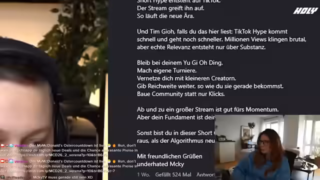 02:42:07Die Streamerin kritisiert den Aufstieg von Tim Geo, den sie als 'Clip-Magnet' und 'viralen TikTok-Farmer' bezeichnet. Sie bemängelt, dass er durch Zufall kurzzeitig große Reichweite erlangte und sich in Widersprüche verstricke, um diese Aufmerksamkeit aufrechtzuerhalten. Sie rät ihm, sich besser auf beständige Content-Entwicklung in der Yu-Gi-Oh!-Szene zu konzentrieren, um nicht wieder in Vergessenheit zu geraten oder ausgezunutzt zu werden.