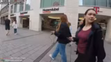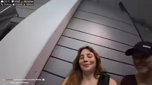00:14:03Die Anreise in die Stadt gestaltet sich aufwendig und wird durch das schlechte Wetter erschwert. Es ist sehr kalt und stark regnerisch, was das Streaming mit der Action-Cam schwierig macht. Verena klagt über ein instabiles WLAN und ein Mikrofonproblem, das ihre Stimme bei lauten Geräuschen, wie dem Regen, unklar werden lässt. Trotzdem erreicht sie den ersten Einkaufsort an der Maximilianstraße.