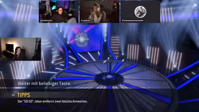 04:53:53Nach den technischen Vorbereitungen beginnt das Team mit dem gemeinsamen Spielen von 'Wer wird Millionär?'. Der erste Versuch scheitert jedoch an einem offensichtlichen Bug in der Software, der eine Frage fälschlicherweise als falsch bewertet, obwohl die Antwort korrekt war. Dies verursacht Frustration und Verwirrung, führt aber dazu, dass das Spiel neu gestartet wird, um den Fehler zu umgehen.