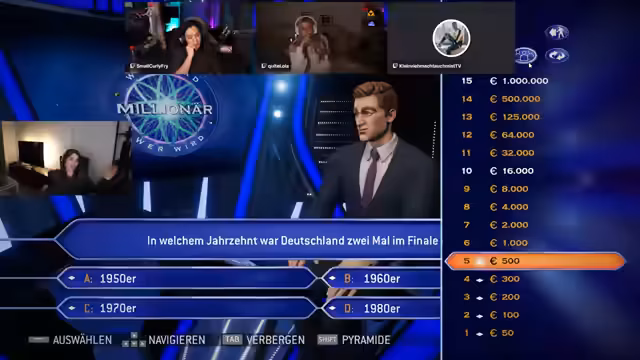 02:56:13Die Quizrunde gestaltet sich als äußerst herausfordernd, da die Fragen über Geografie, Literatur und Popkultur sehr speziell und teilweise unklar sind. Die Teilnehmer geraten ins Stocken und müssen mehrfach auf den Chat-Joker zurückgreifen, um per Umfrage eine Antwort zu erhalten. Bei der Frage nach dem "literarischen Quartett" nutzen sie den 50-50-Joker, sind sich aber unsicher, da der Begriff zu vage ist. Bei der Marvel-Frage über den Vater von Nightcrawler entscheiden sie sich für den Chat-Joker, nachdem das Raten zu ungenau war.