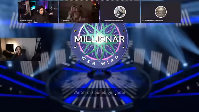 02:46:44Nach erfolgreicher technischer Einleitung beginnt der eigentliche Stream mit der Ankündigung des Formats "Wer wird Millionär?". Verena erklärt die Regeln, darunter, dass der Chat per Emotes keine Tipps geben darf und dass jeder Teilnehmer fünf Joker zur Verfügung hat. Die Teilnehmer identifizieren sich mit einem Alter und begrüßen die anderen Chats, bevor die erste Frage gestellt wird. Die anfängliche Proberunde wird schnell beendet und das ernsthafte Spiel beginnt mit der Frage, was kein Nahrungsmittel aus Vögeln ist.