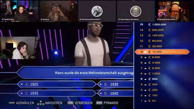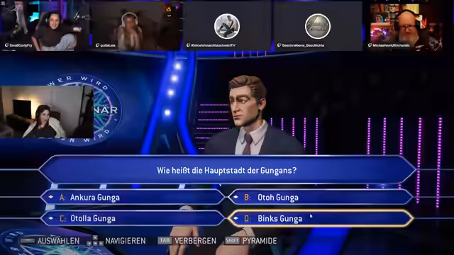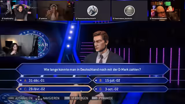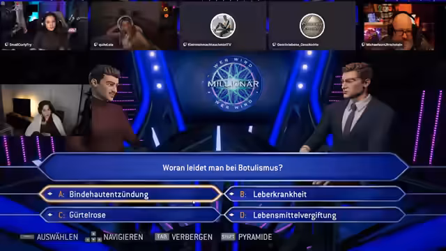 05:40:08Michael wird erfolgreich in den Stream integriert, und es wird über die korrekte Einstellung der Browserquelle in OBS diskutiert. Die Gruppe schließt ISBN und PAL als Antwortmöglichkeiten aus und konzentriert sich auf ASC und ASA. Nach einigen Überlegungen und dem Einholen von Meinungen tendiert die Gruppe zu ASA und tippt richtig. Die nächste Frage dreht sich um Genesis, und die Gruppe tippt erneut richtig. Es folgt eine Ansage an den Chat, den Emote-Only-Chat einzuhalten, um das Vorsagen zu verhindern. Die nächste Frage lautet: Was kann man auf dem Kopf tragen? Die Antwortmöglichkeiten sind Limburg, Homburg, Hamburg und Flensburg. Es wird überlegt, ob es sich um eine Fangfrage handelt und ob der Limburger Käse gemeint ist. Schließlich entscheidet sich die Gruppe für Homburg, ist sich aber unsicher, ob es wirklich einen Hut namens Homburg gibt. Letztendlich wird die Frage richtig beantwortet, und die Gruppe ist auf dem Weg zur Million.