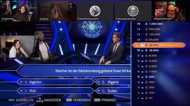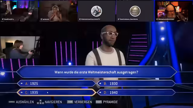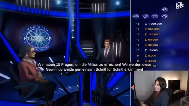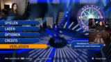 00:33:15Nachdem die technischen Vorbereitungen abgeschlossen sind, beginnt das Spiel 'Wer wird Millionär?'. Die Streamerin agiert als Kandidatin und charakterisiert sich als 69-jährige Rentnerin mit Hobby Minigolf. Die erste Frage, was ein Seiteninstrument ist, führt zu großer Verwirrung, da sie nicht wusste, dass eine Laute ein solches ist. Trotz der mentalen Belastung und Unsicherheit wird die erste Frage korrekt beantwortet und die zweite Frage aufgestellt.