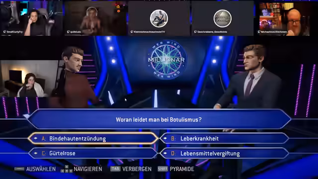 07:02:01Bei einer Frage nach dem Begriff Botulismus gerät das Team ins Grübeln. Es wird über mögliche Antworten wie Lebensmittelvergiftung, Gürtelrose oder Leberkrankheit spekuliert. Die Herkunft des Wortes, die Bedeutung von 'ismus' und die Verbindung zu anderen medizinischen Begriffen werden ausführlich diskutiert. Auch der Chat gibt Tipps, was die Streamerin jedoch als unfair abblockt. Nach einer intensiven Denkpause wird schließlich die Antwort C, wahrscheinlich Bulimie, eingegeben, was sich später als falsch herausstellt und den Einsatz eines Jokers nötig macht.
