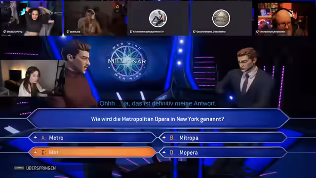 05:16:03Nach der falschen Antwort wird fieberhaft nach kompetenter Unterstützung gesucht, um die Millionen zu gewinnen. Ein Anruf bei Tobi, einem League of Legends-Spieler, scheitert, da dieser gerade beschäftigt ist. Es wird überlegt, weitere Streamer wie Uwe Reinholzen oder Michael von Ulrichstein hinzuzuziehen. Michael von Ulrichstein, der bereits Erfahrung mit Co-Streams hat, wird kontaktiert und erklärt sich bereit, mitzumachen. Währenddessen wird über eine Party-Anekdote gesprochen, bei der Patrick fälschlicherweise für einen Norweger gehalten und von einer Party geworfen wurde. Technische Schwierigkeiten erschweren die Integration von Michael in den Stream, da er Opera GX verwendet und Probleme mit dem Anklopfen hat. Schließlich gelingt es, Michael hinzuzufügen, und die Gruppe hofft auf seinen Sachverstand, um die Krise zu überwinden. Es wird diskutiert, ob ein Quiz mit allen Teilnehmern gestartet werden soll und wie die Auswahl der Anruf-Joker den Spielverlauf beeinflussen könnte.