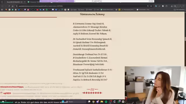 02:39:51 Wenn wir die E's... Wes? Funktioniert nicht. Doni Bang? Doni Bang? E... Ich hab keine Ahnung, ich bin zu dumm. Aber vielleicht gebe ich euch so ein paar Ansätze. Flex hat den Text noch mal reingeballert mit Sternchen. Die DT Schuld. Auch? Alter, das sieht doch aus wie ein Text. Fuck, seht ihr das? Sag mir jetzt nicht, du hast es mit KI gemacht, sondern sag mir wirklich, dass es legit.