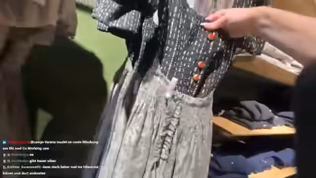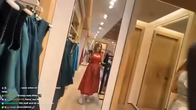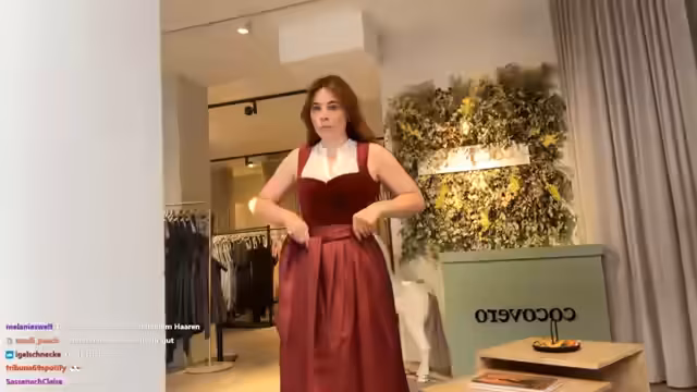 02:23:38Die Streamerin probiert zwei teure Dirndl in verschiedenen Farben. Ein rotes Modell kostet 969 Euro, die dazugehörige Bluse 235 Euro. Sie zeigt auch eine passende rote Herzhandtasche und erhält gemischte Reaktionen vom Chat. Die Anprobe gestaltet sich schwierig, da sie in die Bluse hineinquerulieren muss. Die Verkäuferin bietet gute Beratung und lobt das Outfit, wobei der Preis als erhebliche Hürde für eine sofortige Entscheidung gesehen wird.