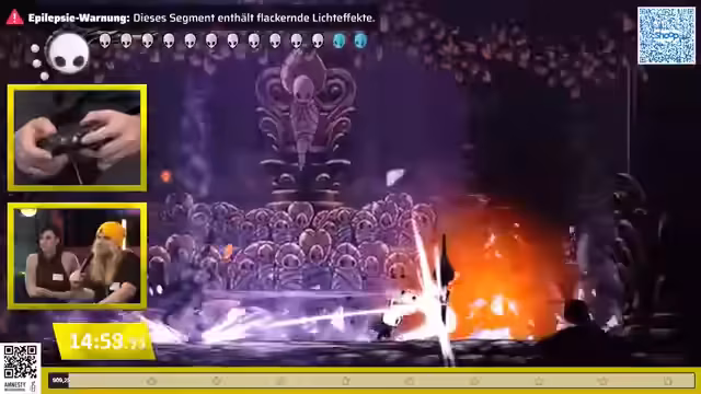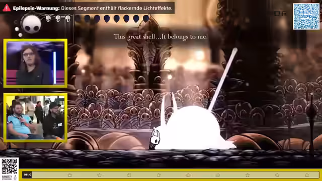 02:01:04Der Speedrun erreicht etwa die Hälfte seiner Strecke, mit einer aktuellen Zeit von 16 Minuten, was auf ein schnelles Tempo hindeutet, da die schwierigeren und glücksabhängigen Abschnitte noch bevorstehen. Inmitten des Geschehens wird die Gelegenheit genutzt, auf den wohltätigen Zweck des Events aufmerksam zu machen: die Unterstützung von Amnesty International Deutschland. Zuschauer werden ermutigt, über den eingeblendeten QR-Code oder den Donation-Befehl im Chat zu spenden, wobei jeder Betrag, egal wie klein, als hilfreich und wunderbar betont wird. Alternativ besteht die Möglichkeit, an einer eBay-Auktion teilzunehmen, deren Erlöse ebenfalls vollständig an die Organisation gehen. Es wird humorvoll angemerkt, dass der Speedrunner selbst bei anspruchsvollen Bosskämpfen die Zeit findet, den Sponsoren zu danken, was seine tiefe Vertrautheit mit dem Spiel und sein "Muscle Memory" unterstreicht.