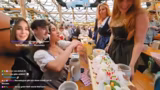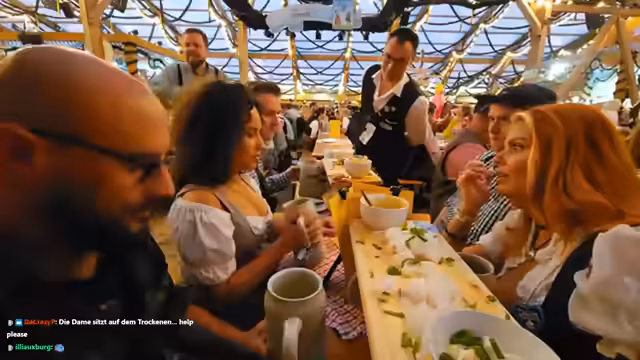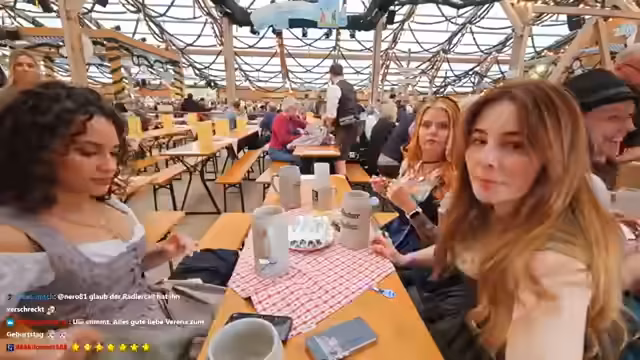 Verena und ihre Gäste feiern eine gemeinsame Geburtstagsparty auf dem Oktoberfest. Nach der Ankunft am reservierten Tisch wurden die Getränke bestellt und die Geburtstagslieder ertönten. Die gesellige Runde trinkt gemeinsam und führt lockere Gespräche. Dank zahlreicher Spenden aus dem Chat konnten die Getränke finanziert werden. Die Stimmung ist ausgelassen und feierlich.