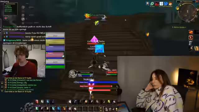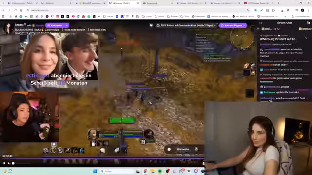 00:39:50Die Streamerin und der Chat schauen Ronny Bergers Todesminen-Run live. Sie kommentieren seine Spielweise, besonders seine Rolle als Main-Heiler. Es werden Strategien für die Kämpfe besprochen, und die Streamerin gibt Ratschläge, wie man sich am Rand der Schlachtfelder bewegen sollte, um nicht überwältigt zu werden. Ronny wird als konzentriert, aber auch als potenzieller Unruhestifter wahrgenommen, da er die Gruppe in Gefahr bringen könnte.