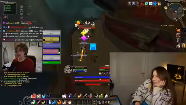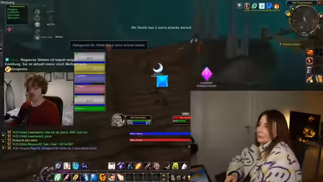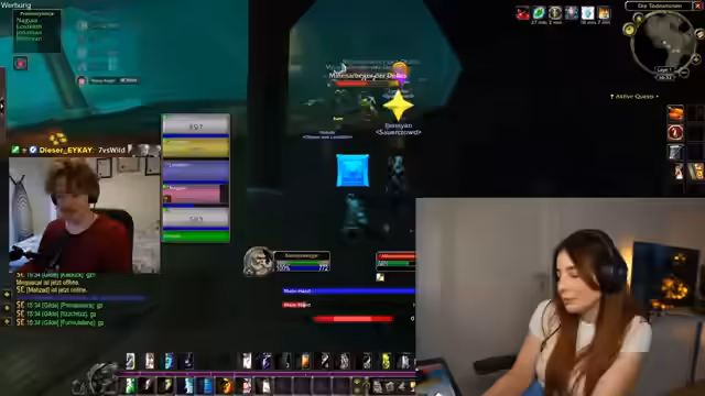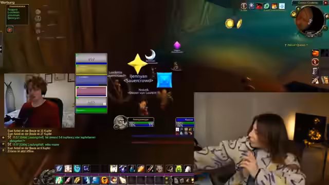 03:02:38Nach einem gemeinsamen Entscheidungsprozess beginnt die Streamerin als Priesterin einen Panorama-Kampf in der Sauerkrautgilde. Es finden Abstimmungen bezüglich der Rasse statt und eine ausführliche Diskussion über das Nachtelfen-Voting findet statt. Die Streamerin meldet technische Schwierigkeiten mit einem Proximity-Voice-System, da sie niemanden hört und das System noch nicht verstanden hat. Nach der Beseitigung der technischen Probleme plant sie, mit der Gruppe quests zu machen, Erfahrungspunkte zu sammeln und den Level 17 zu erreichen.