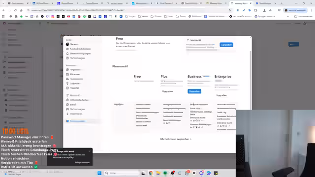 03:02:32Es wird die Thematik der Finanzplanung angesprochen, wobei Vorlagen für Finanzpläne, Budgetierung und Cashflow-Tracking gesucht werden. Der Fokus liegt auf der Erstellung eines Schuldenfrei-Planers und eines Unternehmensfinanzplaners. Es wird erwähnt, dass Finanz-Tracking ein fortlaufender Prozess ist, der nicht einmalig abgeschlossen werden kann. Die Spam-Flut der Gamescom wird thematisiert, und es wird erwähnt, dass der Privatbereich in Notion selbstständig eingerichtet werden kann, während die Teamspaces zusammen mit Eva bearbeitet werden müssen. Die Kosten für Notion Plus werden als zu teuer empfunden, und es wird festgestellt, dass Zapier nur mit einem Business-Account eingebunden werden kann. Trello wird als eine kleinere Funktion von Notion betrachtet, und es wird der Wunsch geäußert, alle Tools in einer einzigen Plattform zu vereinen, um die aktuelle Nutzung von fünf verschiedenen Tools zu reduzieren.