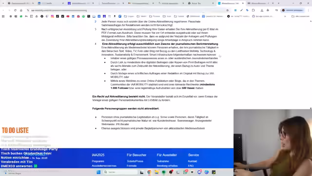 00:46:26Es wird über Menstruationsbeschwerden gesprochen und eine Menstruations-App vorgestellt, die den Zyklus trackt und Symptome aufzeichnet. Es wird über das Thema Dammriss während der Geburt gesprochen und die damit verbundenen Schmerzen thematisiert. Es wird sich von dem Thema Dammriss distanziert und auf das bevorstehende Coworking hingewiesen. Anschließend wird versucht, die IAA-Akkreditierung zu beantragen, was jedoch aufgrund von Problemen mit dem Link und der Frage, ob man als Presse oder Content Creator gilt, schwierig gestaltet. Es wird die Notwendigkeit einer Drehgenehmigung betont und auf die Themen Mobility, Technology, Innovation, Sustainability und Environment hingewiesen, die auf der Messe behandelt werden.