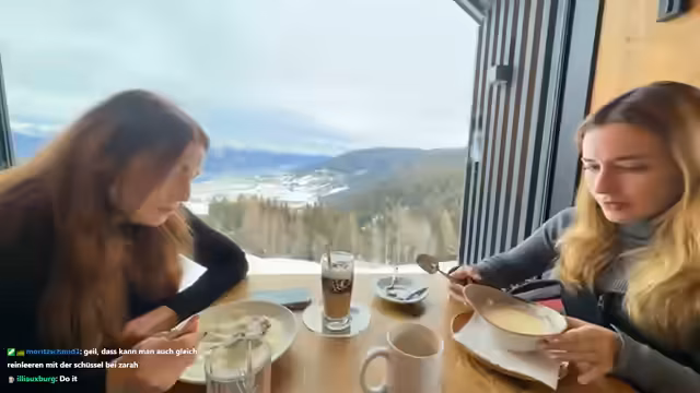 03:32:59Verena und Sarah genießen Vanillesoße und Apfelstrudel. Diskussion über Vanillesuppe statt Glühwein, später erhalten sie eine riesige Suppenschüssel voller Vanillesoße. Begeisterte Reaktionen auf die Süßspeise, Verena experimentiert mit dem Schlürfen und lobt den Geschmack. Sie reflektieren über Kalorien und Figur, während sie den Kaffee und Dessert genießen. Der Chat wird über die kulinarischen Highlights informiert.