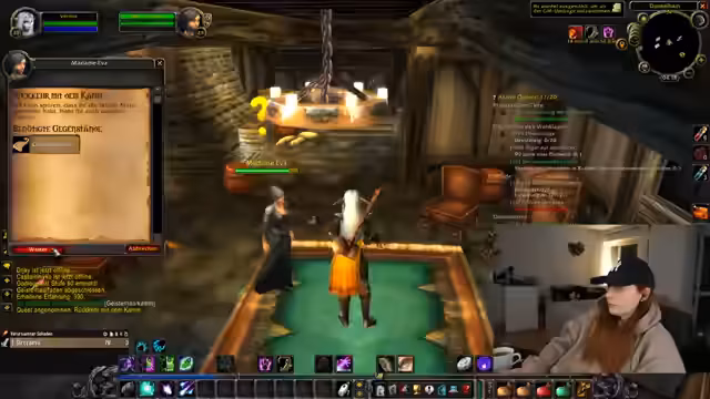 00:10:50Nachdem die persönlichen Themen besprochen wurden, wechselt die Sprecherin ihr Geschäftsgespräch und geht zum World of Warcraft-Gameplay über. Sie diskutiert mit ihrem Chat, wo sie am besten questen kann, erwähnt Gebiete wie den Dämmerwald und verweist auf vorherige Quest-Erfahrungen. Hier zeigt sich das Streben, die unruhige Nacht durch produktives Gaming zu überbrücken. Der Abschnitt geht in das detaillierte Questen über, wobei sie auch auf Schwierigkeiten mit Gegnern und dem Auffinden von Gegenständen eingeht. Dies markiert den Beginn des eigentlichen Spielinhalts, der den Rest des Streams füllen wird.