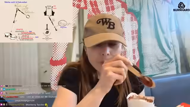 05:10:58Im McDonald's angekommen, nutzt die Streamerin die Ladepause, um sich und Peggy zu stärken. Sie bestellt Essen und interagiert intensiv mit dem Chat, der ihr bei der Bestellung hilft. Gleichzeitig wird die Diskussionsfreudigkeit der Community deutlich, als immer wieder neue, oft widersprüchliche Hinweise auf mögliche Ei-Verstecke vorgeschlagen werden. Der Fokus verlagert sich von der aktiven Suche auf das Abwarten der Erkenntnisse der Arbeitsgruppe im Discord und das Planen des weiteren Vorgehens.