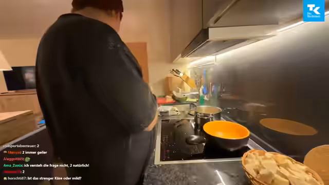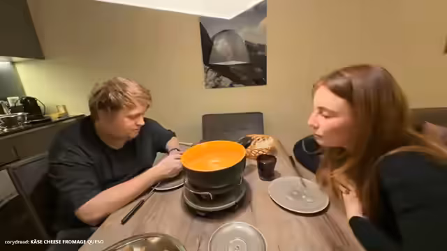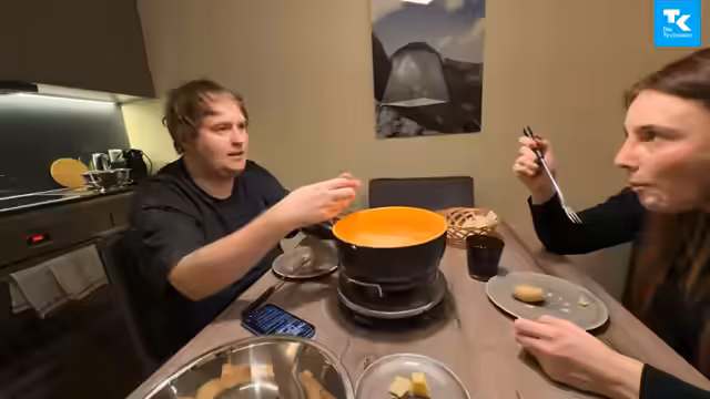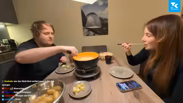 05:44:20Das Fondue wird zubereitet: Der Käse erreicht die perfekte cremige Konsistenz. Moritz und Verena genießen es mit Brot und Kartoffeln. Der Höhepunkt ist das Experiment 'Käse im Käse': Sie tunken Davoser Hartkäsestücke in das Westschweizer Fondue. Beide sind begeistert von der ungewöhnlichen Kombination. Es folgen kreative Ideen für Fusion-Fondue (z.B. Cheeseburger oder Chicken Nuggets eintauchen), die für zukünftige Streams geplant werden.