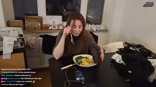 00:58:31Die Streamerin bereitet ein Essen mit gewaschenen Kartoffeln, Spinat und gemischten Eiern zu. Während des Kochvorgangs wird im Chat über die Portionsgröße diskutiert. Sie betont, dass sie als starke Frau große Portionen benötige, da sie eine Macherin sei. Dabei werden auch die Essgewohnheiten der Zuschauer thematisiert und es stellt sich heraus, dass sie unter anderem ihre Burger mit Messer und Gabel isst.