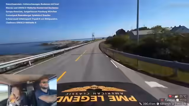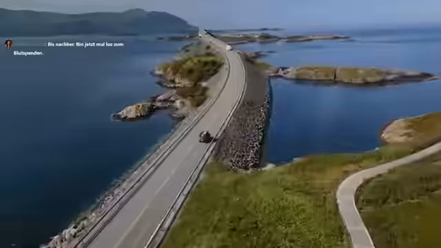 02:19:57Die Streamer erreichen die berühmte Atlantikstraße in Norwegen, eine 8000 Meter lange Straße zwischen Inseln. Sie sind beeindruckt von der engineering-Meisterleistung und fahren über die Brücke. Gleichzeitig wird im Chat über deutsche Touristenattraktionen diskutiert, wie Schlösser, Burgen und historische Gebäude. Der Streamer erwähnt, dass viele Touristen nach Deutschland fahren, um abzuschalten und das Internet für soziale Medien zu meiden, besonders in ländlichen Gebieten wie dem Schwarzwald.