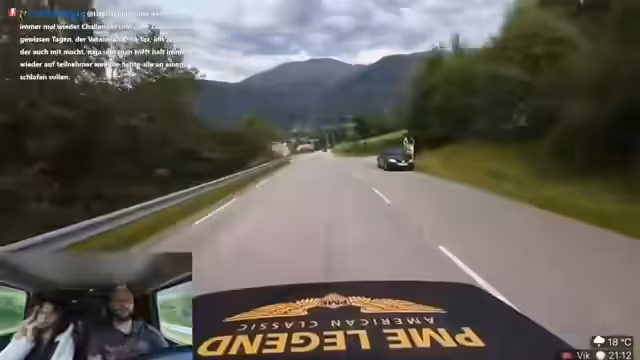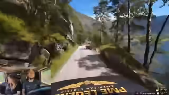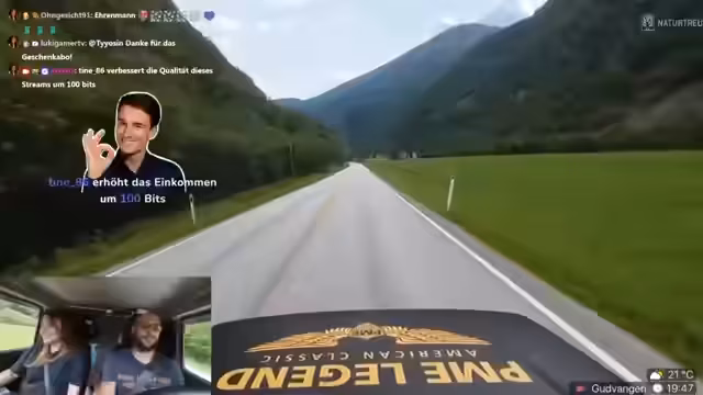 10:45:20Verena startet den Tag 4 des Streams mit der Beschreibung des aktuellen Ortes, der wie vor einem Greenscreen aussieht. Danny erwähnt, dass er die Drohne noch nicht aktiviert hat. Sie fahren über einen Pass mit atemberaubenden Wasserfall-Aussichten. Die Landschaft wird als 'geil', 'wuschig' und 'krass' beschrieben. Verena äußert den Wunsch, dass sie noch oben hochgefahren wären, um im Schnee eine Schneetaufe zu veranstalten. Die Fahrt ist von vielen Kurven und der schönen Natur geprägt.