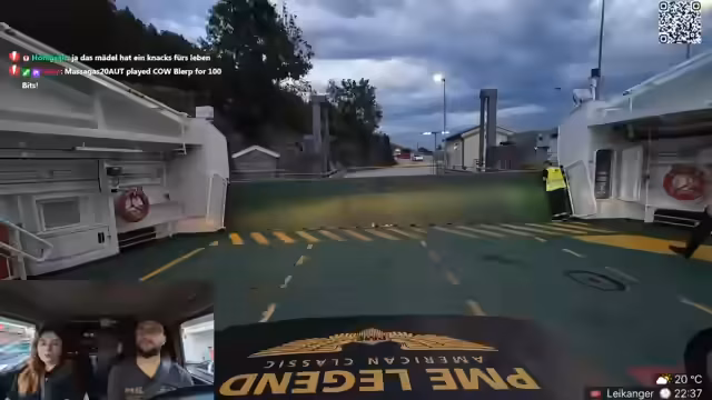 13:19:48Während der Wartezeit auf die Fähre treten technische Probleme auf, insbesondere bei der Übertragung von Sounds. Ein Zuschauer meldet, dass die Box ausgefallen sei. Die Streamerin versucht, die Situation zu meistern, während Danny einen Clip abspielen möchte. Es wird erwähnt, dass sie mit einer Drohne Aufnahmen machen und das Auto über Solaranlagen und Batterien aufgeladen wird. Kurze Zeit später wird die Fähre gesichtet und die Streamerin unterbricht den Stream kurz.