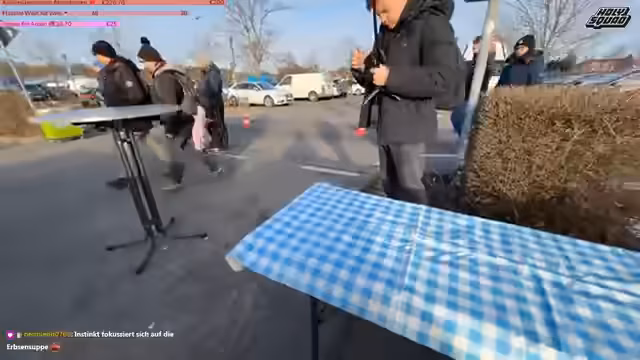01:32:54Die Streamer genießen ihre erworbene Erbsensuppe, die selbstgemacht und laut Aussage des Verkäufers sehr schmeckt. Während des Essens kommt es zu technischen Problemen mit dem Chat-Handy, da die Streamerin kein Offizielles Chat-Banner nutzt. Der Streamer betont die Kälte und die Herausforderung, im Winter bei Minusgraden auf dem Flohmarkt zu streamen, und spricht über die Belastung durch das ständige Halten des Equipments und die körperlichen Beschwerden.